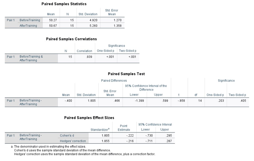 The analysis yielded a two-tailed p-value of 0.405, which exceeds the conventional significance level of α = 0.05. This result suggests that there is insufficient evidence to reject the null hypothesis, indicating no statistically significant difference between the pre- and post-training performance scores.