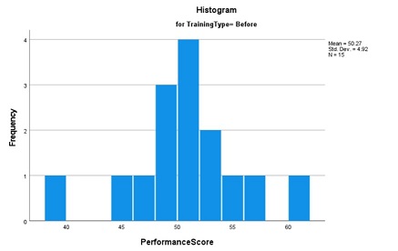 Prior to the training intervention, the sample exhibited a mean performance score of 50.27, with a median of 51. The proximity of these values suggests a relatively symmetric distribution of scores. The 95% confidence interval for the population mean was calculated to be 47.54 to 52.99, indicating a moderate level of precision in our estimate of the true population parameter.