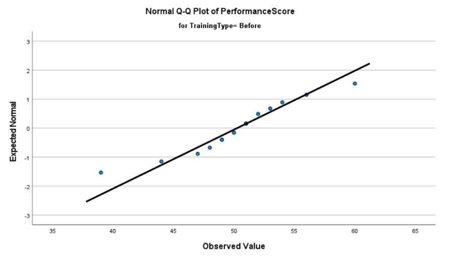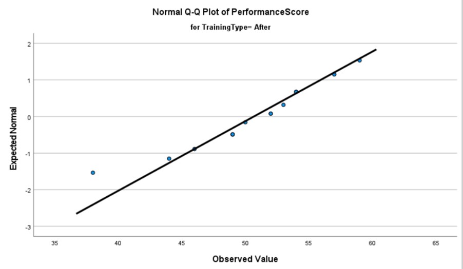 For the pre-training data, the Shapiro-Wilk test yielded a p-value of 0.794, while the post-training data resulted in a p-value of 0.497. In both cases, the p-values exceed the conventional significance level of α = 0.05, indicating a failure to reject the null hypothesis. Consequently, we do not have sufficient evidence to conclude that either dataset deviates significantly from a normal distribution.