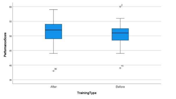 The pre- and post-intervention box plots both exhibit symmetry, suggesting normal distributions for both data sets. In the post-intervention box plot, we observe an increase in the median value and a broader range of scores. These changes indicate a potential positive impact of the training intervention on employee performance. Specifically, the upward shift in the median and the expanded range of scores suggest that the training may have contributed to an overall improvement in performance across the employee cohort.