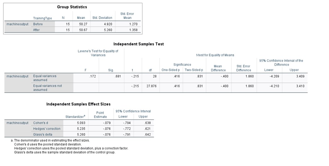 Examining the descriptive statistics, we observe a modest increase in the mean performance score of 0.4 units following the training intervention. However, this observed difference lacks statistical significance, as indicated by the p-value. It is crucial to note that while the mean score increased slightly, this change cannot be unequivocally attributed to the training program alone. Extraneous variables, such as individual employee factors, workplace dynamics, or other external influences, may have contributed to this marginal improvement.
