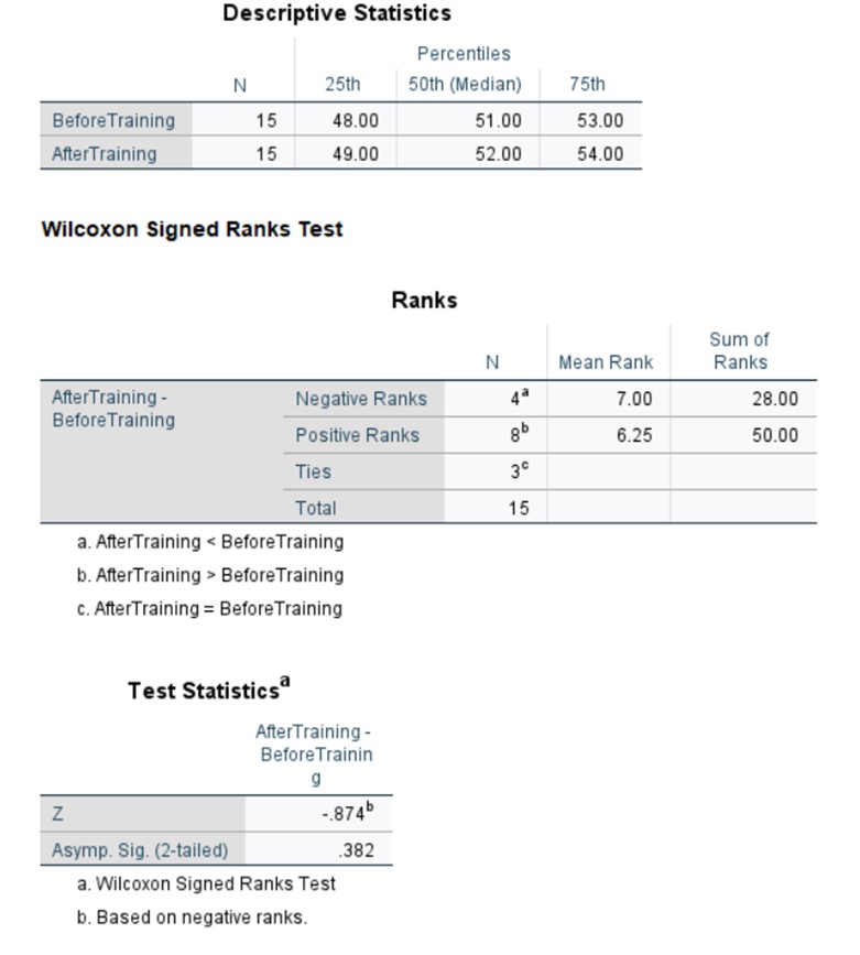 The analysis yielded an asymptotic significance (2-tailed) of 0.382. This p-value, being considerably greater than the conventional alpha level of 0.05, fails to provide sufficient evidence to reject the null hypothesis. Consequently, we cannot conclude that there is a statistically significant difference between the pre- and post-training performance scores.